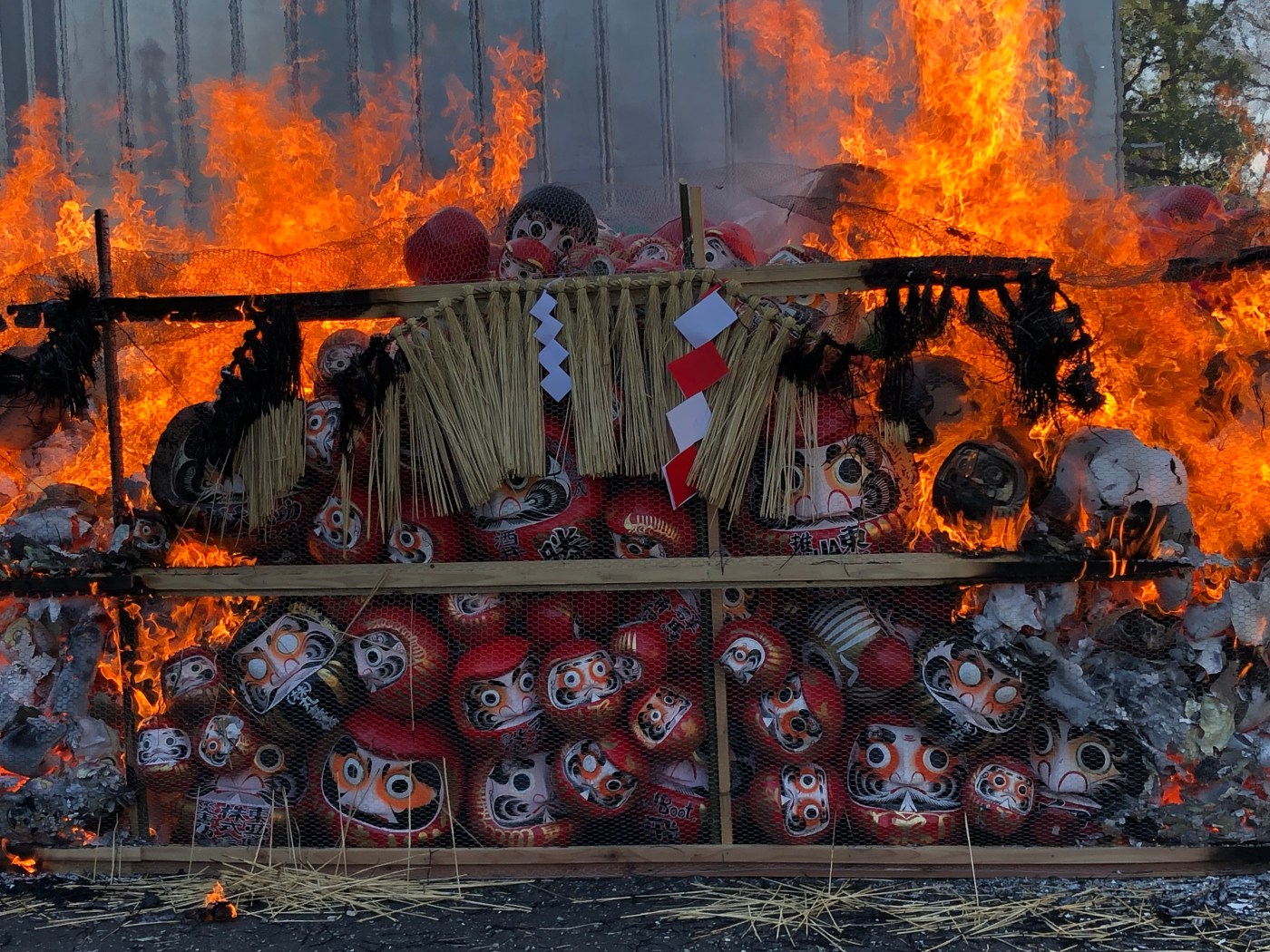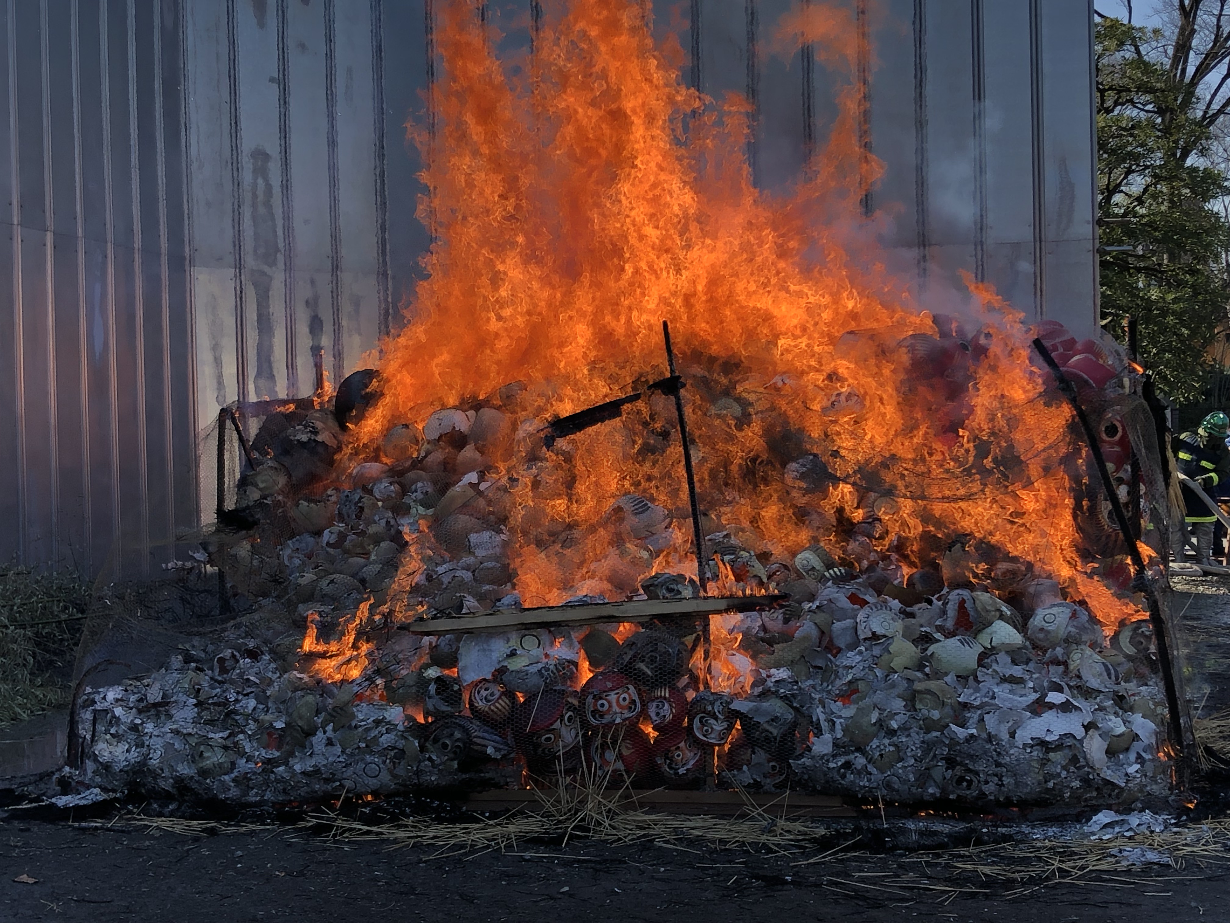 Il calore proveniente dal falò era veramente intenso, e i pompieri sono dovuti intervenire per controllare la direzione delle fiamme spruzzando acqua sulle pareti delle barriere di metallo che circondavano due lati della pira funeraria. Accompagnati dalle preghiere dei monaci, i daruma scoppiettavano allegri mentre venivano consumati dalle fiamme.