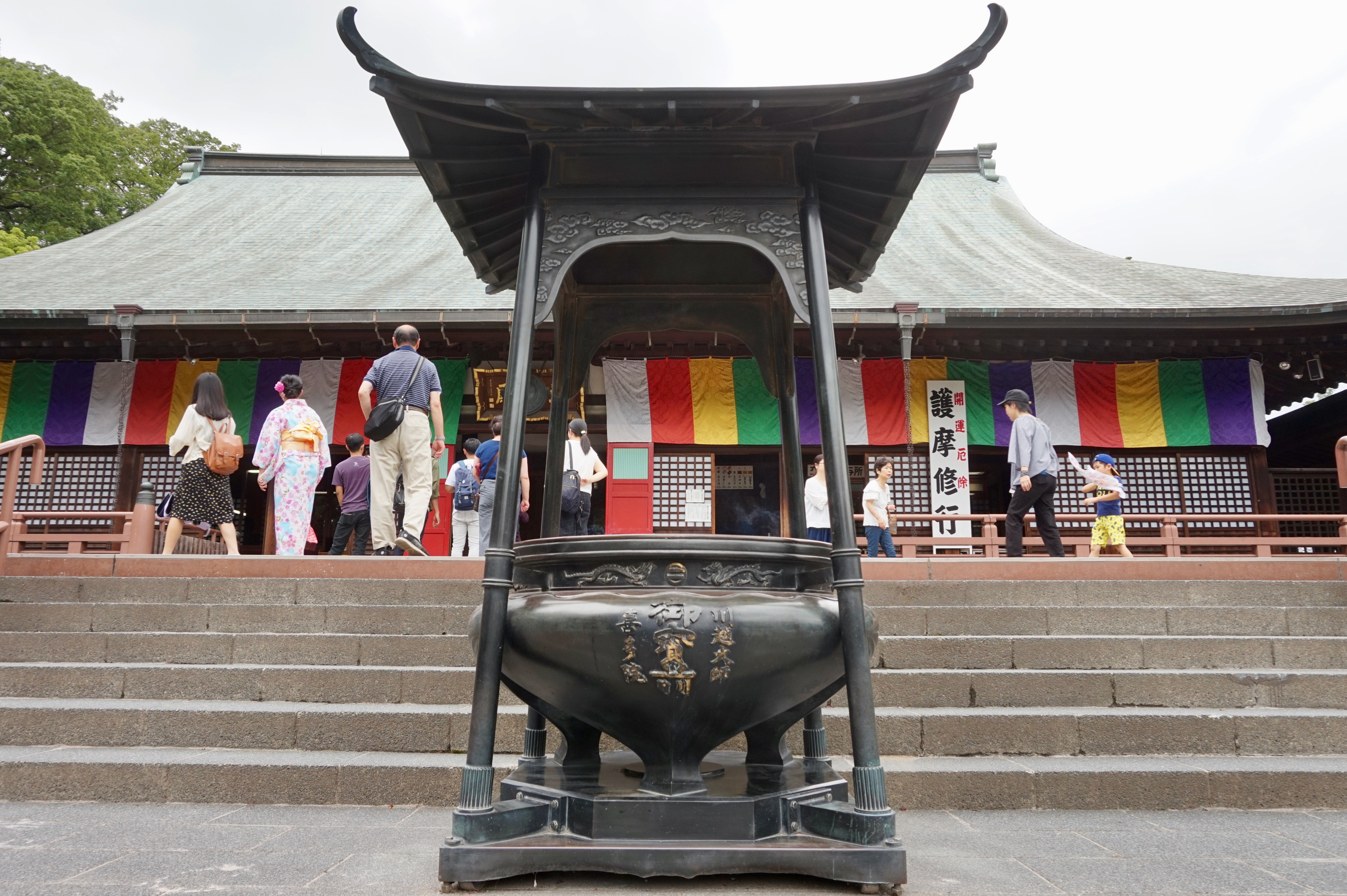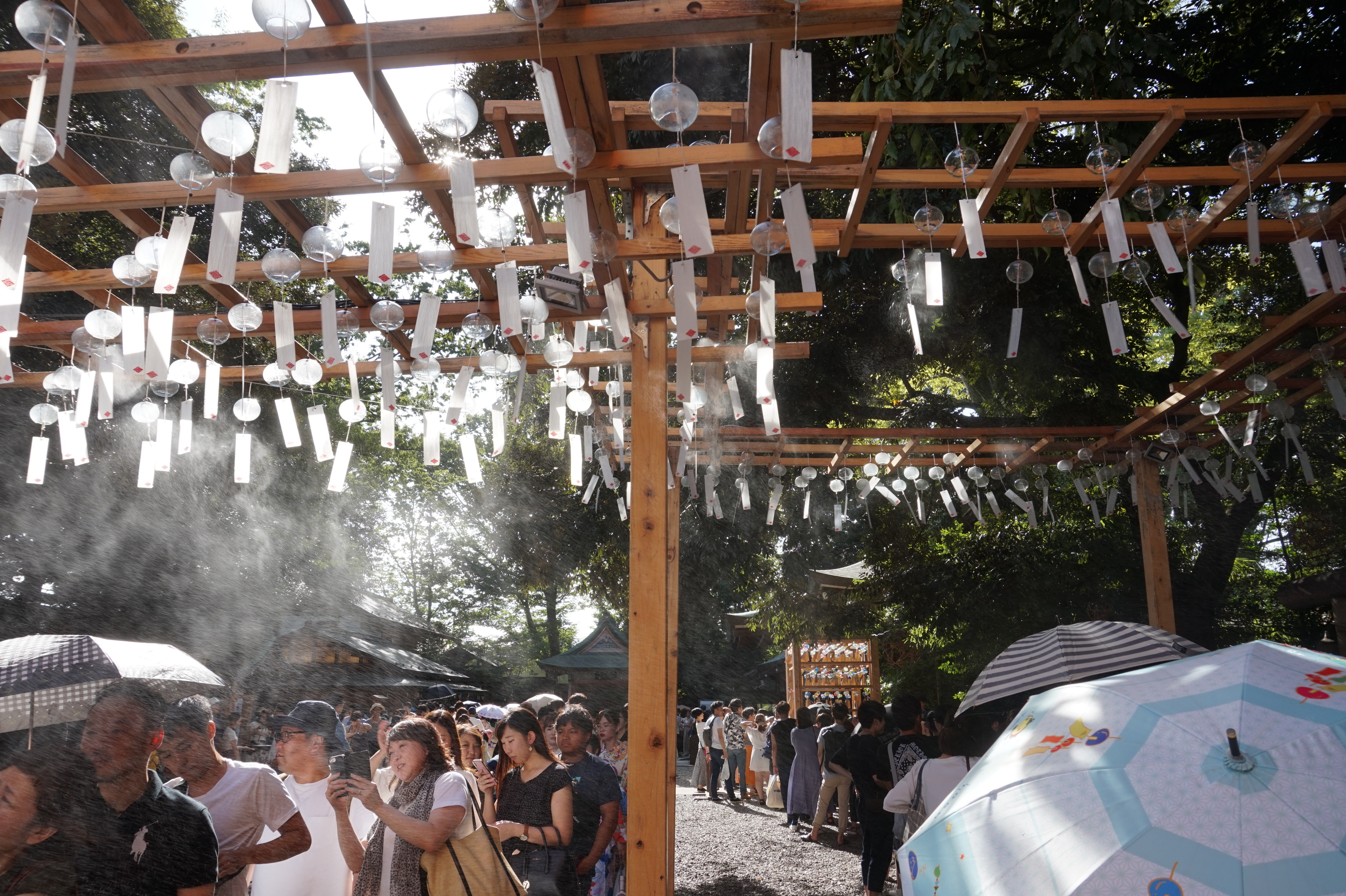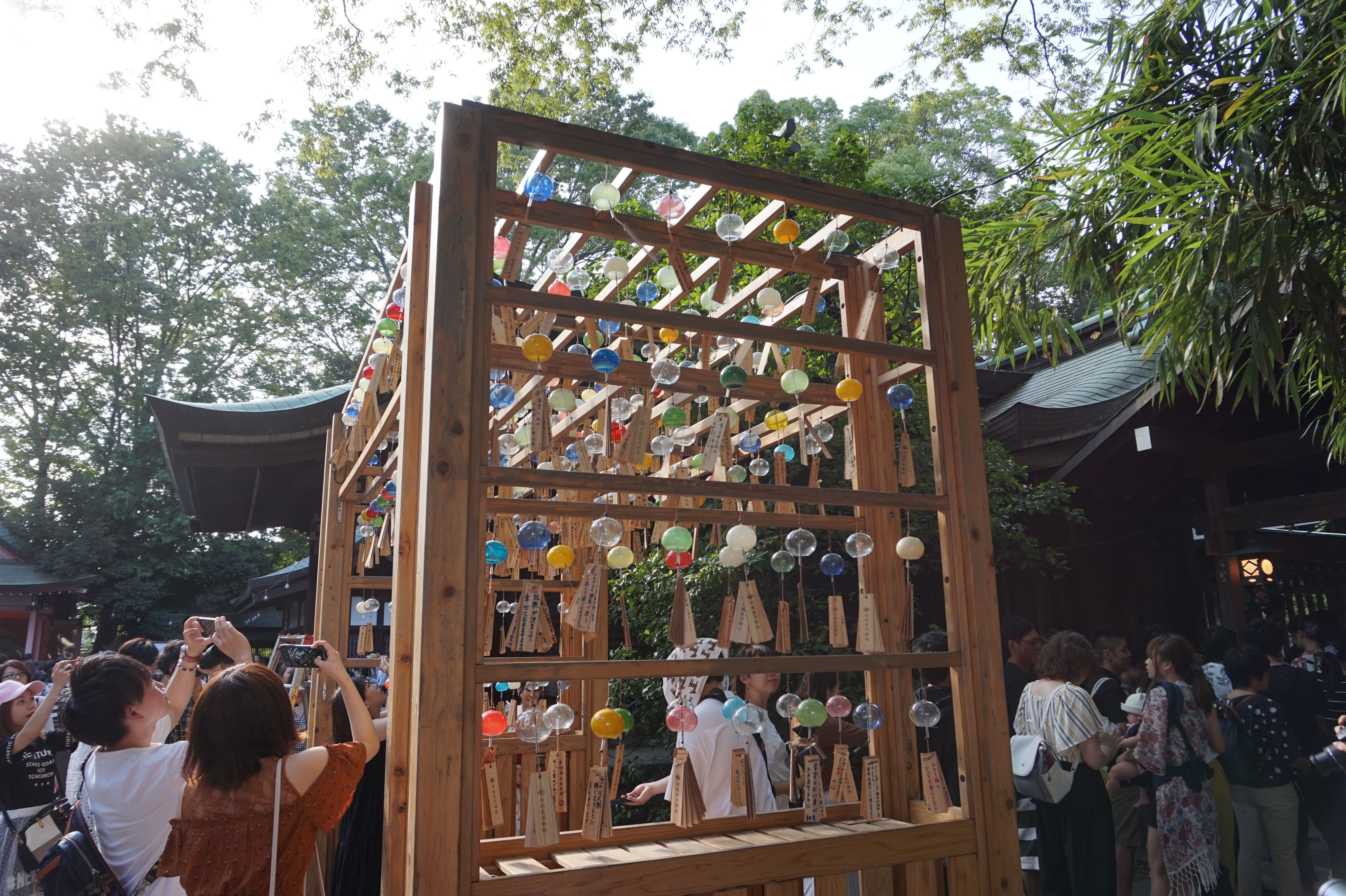 Il tempio Hikawa è uno dei templi meno conosciuti a Kawagoe, ma durante l’estate si riempie di turisti grazie al festival dei 風鈴 fūrin, le campanelle a vento, che lo rendono ancora più fotogenico del solito. Vengono infatti creati dei percorsi lungo i quali si possono ammirare i colori del vetro ascoltando il suono delle campanelle mosse dal vetro. Anche qui ci sono lunghe file, ma acqua vaporizzata viene spruzzata durante l’attesa per fornire un po’ di refrigerio.