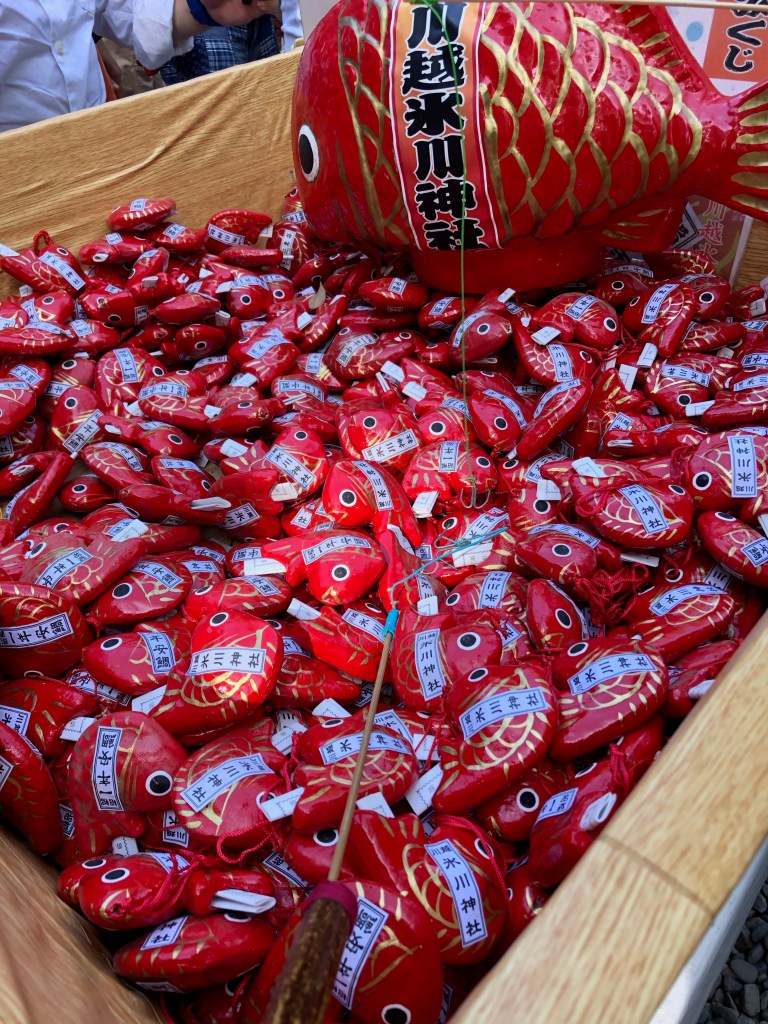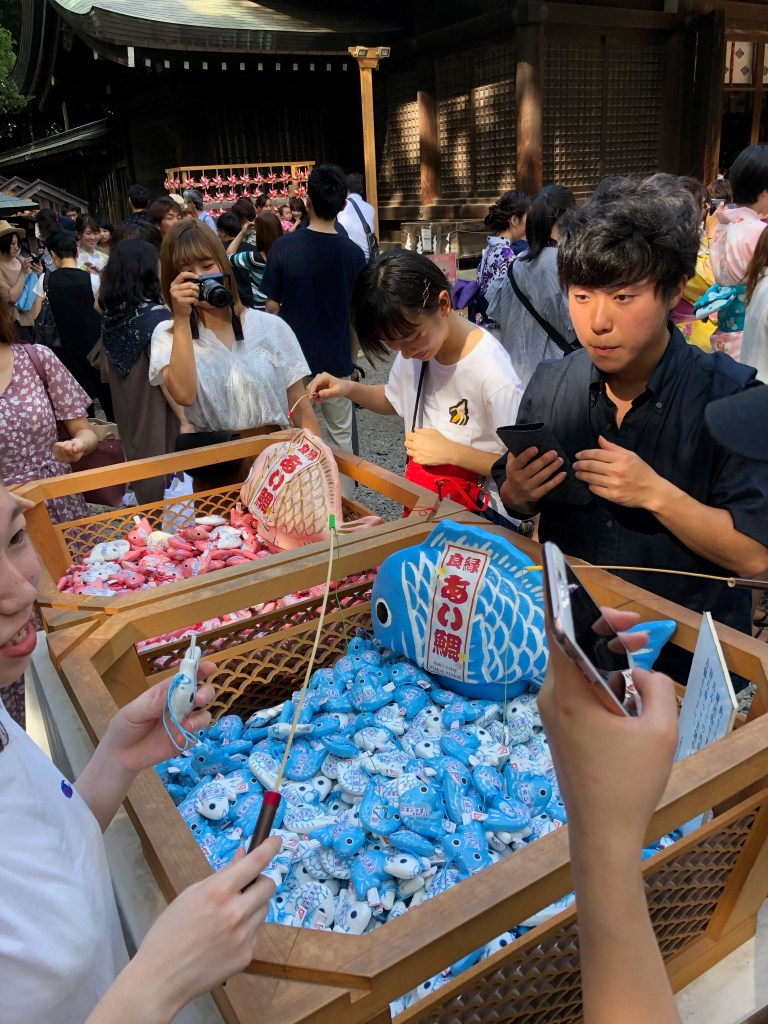 Un’altra delle attività riguarda la pesca (in senso letterale) della propria fortuna. In genere in tutti i templi giapponesi si può dare un’offerta per acquistare un omikuji, ossia un biglietto che contiene una predizione sul proprio futuro. Al tempio Hikawa ci sono delle canne da pesca per prendere il proprio omikuji, che è custodito in un pesce di legno di colore rosso, azzurro o rosa. Proprio accanto all’ingresso del tempio c’è un acquario con gli omikuji in inglese. Se l’omikuji è negativo, si potrà legare in un’area del tempio così da lasciarsi alle spalle la cattiva sorte.