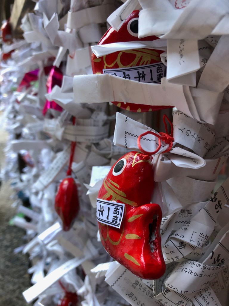 Another one of the activities involves “fishing” your luck. As in many temples, you can get an omikuji, where your fortune is written. At hikawa temple, the omikuji is wrapped and put inside a wooden fish (either red, pink or blue). For us foreigners, you can find a fish bowl with English fortunes near the entrance of the temple. If your omikuji has bad fortune, you can tie it in a specific area of the shrine so you will leave your bad fortune behind.