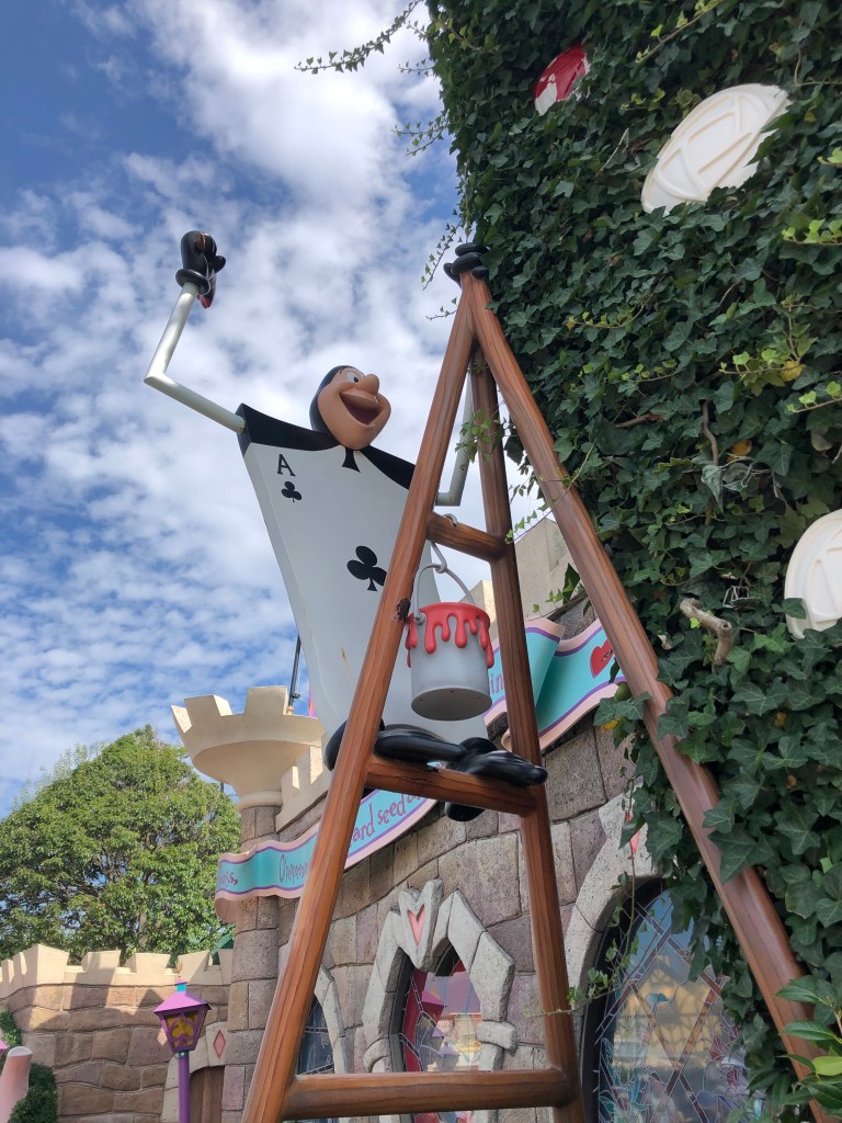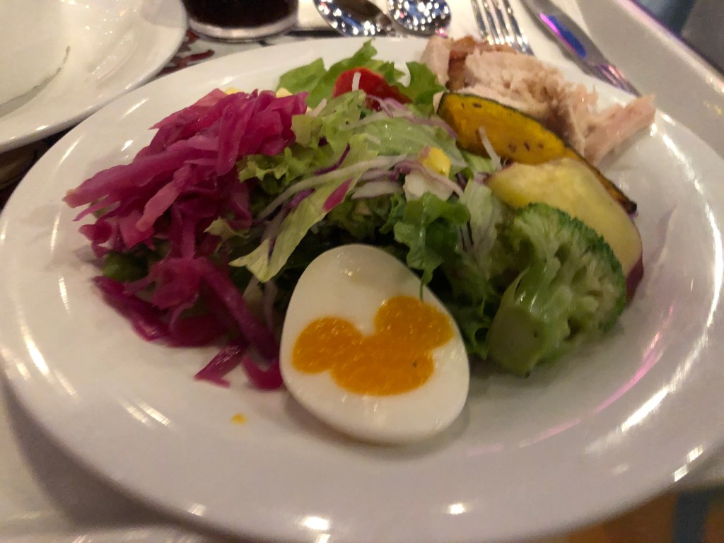 A Fantasyland ci abbiamo anche pranzato, precisamente nel ristorante della Regina di Cuori. La maggior parte dei piatti in questo ristorante ha un elemento a forma di cuore: il formaggio sull’hamburger, un pomodoro tagliato a forma di cuore e altri dettagli. Io ho ordinato solo un’insalata con un uovo con il tuorlo a forma di Mickey Mouse… mi sono tenuta leggera perché abbiamo anche ordinato una mini-torta di compleanno! Parlando di compleanno, se vi capita di visitare Disneyland il giorno del vostro compleanno, potete dirlo a un membro dello staff e vi daranno uno sticker di buon compleanno. Tutti i membri del cast che vedranno il vostro sticker durante la giornata vi faranno gli auguri di buon compleanno!